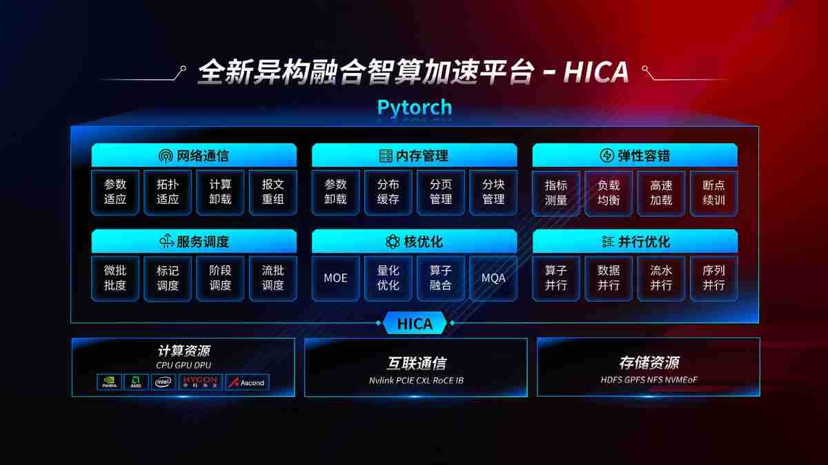 通过自研的服务层、、、、中间适配层、、以及调度编排算法,,,采用数据并行、、模型并行等多种并行方式,,把并行计算任务进行有效的分解,,,,使其分别由相应的软件栈和算力资源来承接。。当GPU资源变化,,,,HICA可以实时动态调度计算子任务并调整模型拓扑和架构,,以充分聚合各种算力资源。。