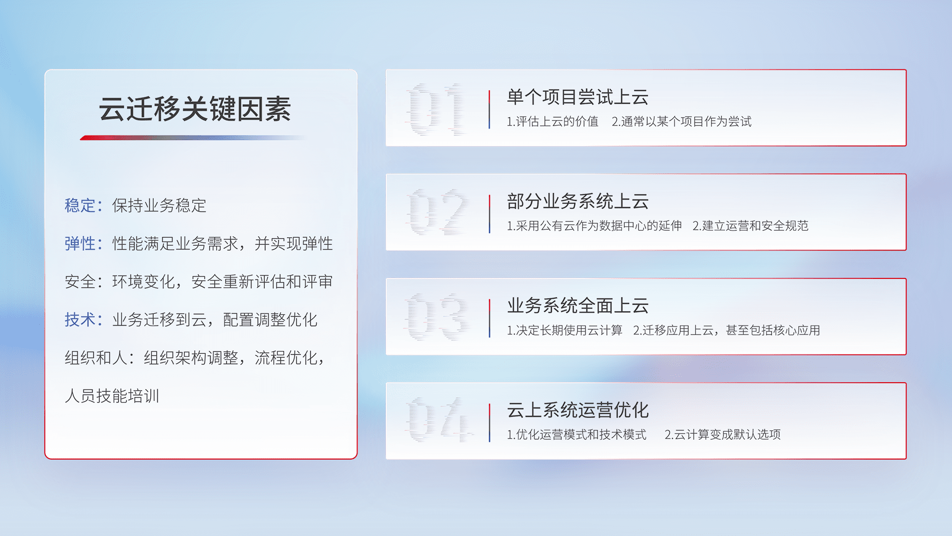 结合实际业务,,,,从规划设计、、云平台选型、、云原生改造、、、、数据迁移、、、集成交付,,,,迁移全过程为客户识别最佳上云路径,,做好风险识别管理,,,设计网络架构、、、身份权限、、、、安全审计合规、、操作审计、、、、日志审计、、、、监控告警策略、、多站点容灾设计等,,,对云上基础设施进行整体规划,,提升IT治理水平,,以满足弹性、、、高可用、、、、高性能的需求。。。