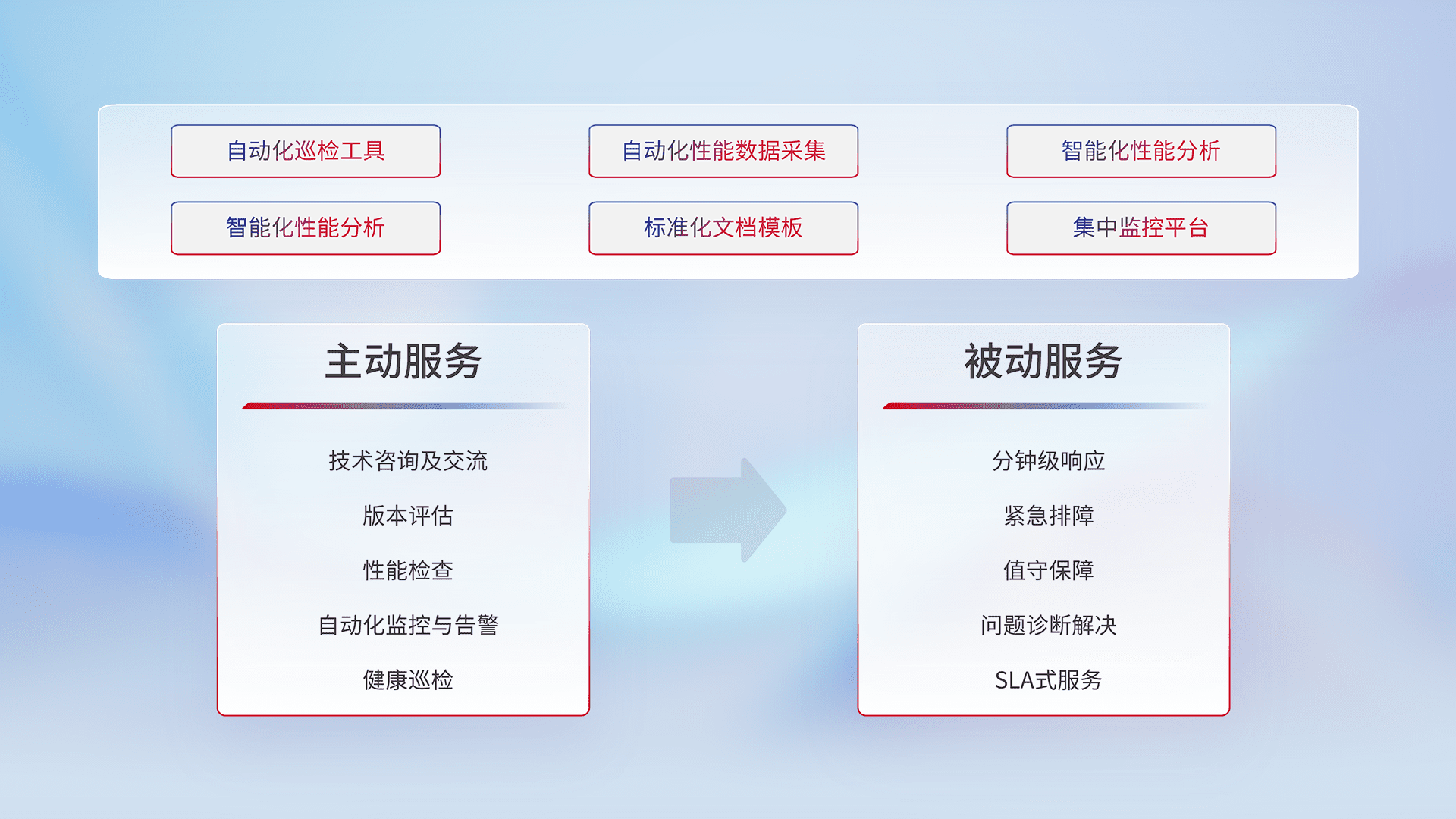 智能化工具和标准化文档,,,保障服务质量,,,,提供主动服务(包含技术咨询、、、版本评估、、性能检查、、、自动化监控与告警、、、、健康巡检)和被动服务包含(分钟级响应、、、、紧急排障、、、值守保障、、、问题诊断解决、、SLA服务)。。。。